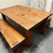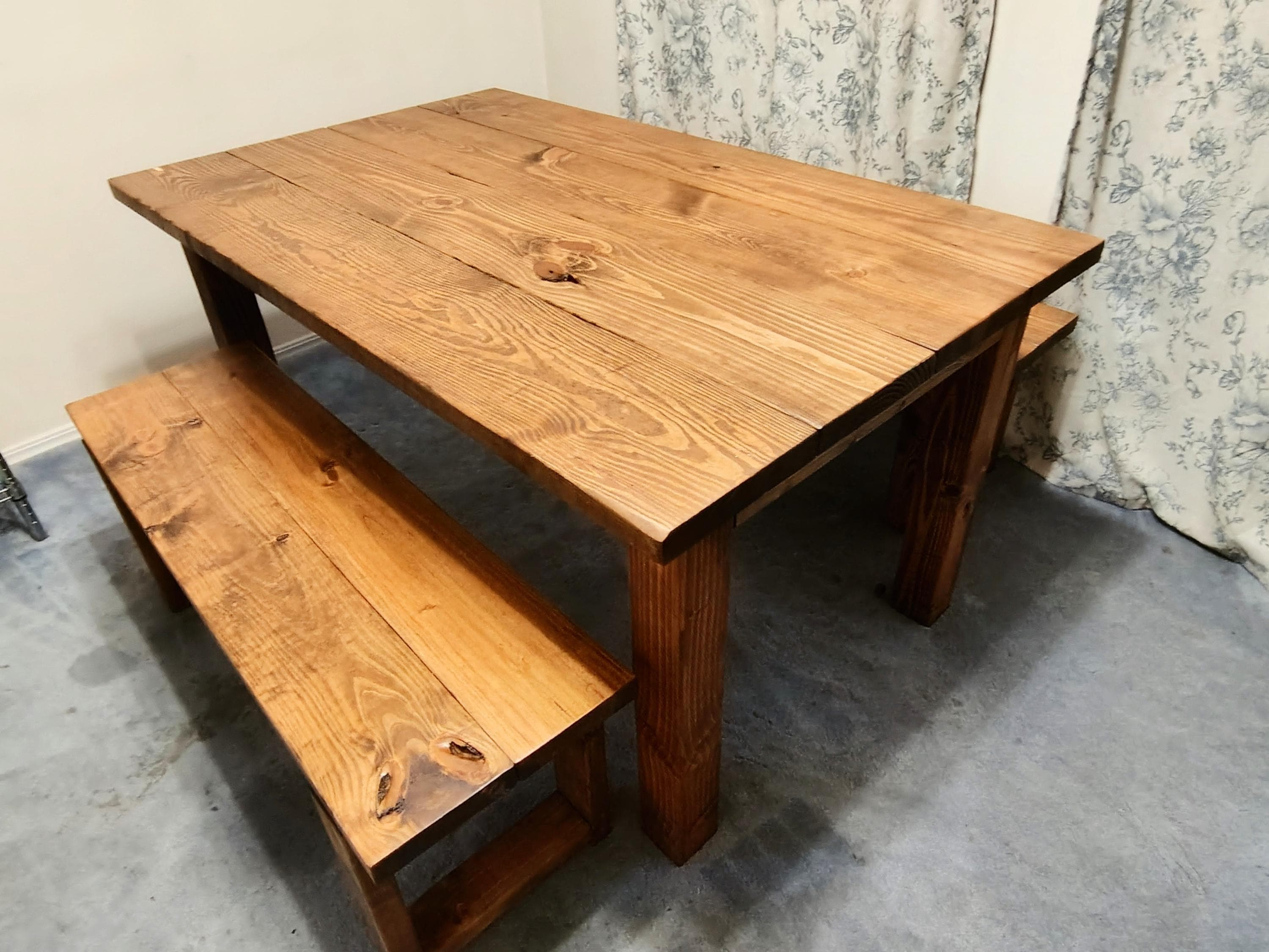 Bring this small 5ft modern farmhouse table with benches into your home today. The kitchen table is stained a honey brown. This dining set comes with two wooden benches. The set has a matte poly finish for protection. Great for any dining room or kitchen area!
