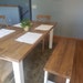Bring this rustic farmhouse table set into your home today the set comes with a bench and four chairs. The dining set is finished with a Early American brown stain and a white base. While the chairs are stained all the way through. The kitchen table set has a matte poly finish for protection.